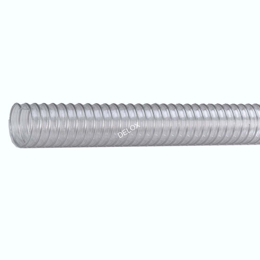 永久抗靜電聚醚型聚氨酯材質(zhì)(R≦109Ω),不銹鋼絲螺旋加強。非螺旋處壁厚恒定為0.9毫米。內(nèi)壁平滑機械特性及真空性能卓越,柔韌,易彎曲,抗菌, 抗水解,抗老化,耐臭氧,耐紫外線,耐候性、耐多種化學品。不含鹵素,不含鄰苯二甲酸鹽。軟管兩端螺旋鋼絲接地可排靜電。